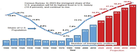 PEW Research states that More than 41 million immigrants lived in the U.S. as of 2013, more than four times as many as was the case in 1960 and 1970. By comparison, the U.S.-born population is only about 1.6 times the size it was in 1960. Immigrant population growth alone has accounted for 29 percent of U.S. population growth since 2000.