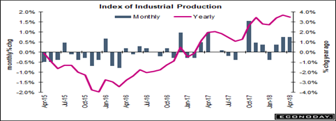 And manufacturing is picking up for the second straight month. Industrial production rose 0.7 percent in April, the Federal Reserve said Wednesday. Strength is the message from industrial production which rose 0.7 percent in April on top of an upward revised 0.7 percent gain in March, which should boost Q2 GDP growth above the 1.9 percent Q1 initial estimate. But that won’t get us to 3 percent GDP growth, either. Manufacturing production moved 0.5 percent higher. Mining once again leads the gains with a 1.1 percent surge in the month with utility output also positive at a 1.9 percent gain.
