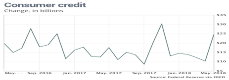Consumer borrowing picked up in May, according to the Federal Reserve on Monday. Total consumer credit increased $24.6 billion in May to a seasonally adjusted $3.9 trillion. That’s an annual growth rate of 7.6 percent, which is the fastest credit growth since November.