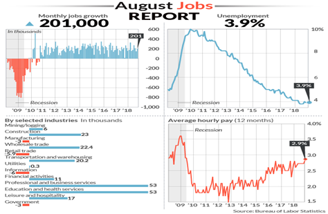 Total nonfarm payroll employment increased by 201,000 in August, and the unemployment rate was unchanged at 3.9 percent, the U.S. Bureau of Labor Statistics reported today. Job gains occurred in professional and business services, health care, wholesale trade, transportation and warehousing, and mining.