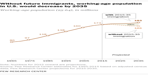 For most of the past half-century, baby boomers — those born after World War Two and before 1965 — have been the main driver of the nation’s expanding workforce, but now that they’re heading into retirement only two groups of workers are projected to grow over the next two decades: immigrants and those whose parents are first-generation immigrants, a new report by the Pew Research Center, a nonprofit think tank in Washington, D.C., concluded. “The most important component of the growth in the working-age population over the next two decades will be the arrival of future immigrants,” it said.