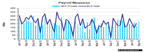 ADP, or Automatic Data Processing, predicts 230,000 private payroll jobs could be created in September per tomorrow’s U.S. unemployment report. The reason is both the manufacturing and non-manufacturing (service) sectors reported strong hiring in their ISM indexes, which are surveys of supply managers in those industries, and where indexes above 50 indicate expansion in their sectors.