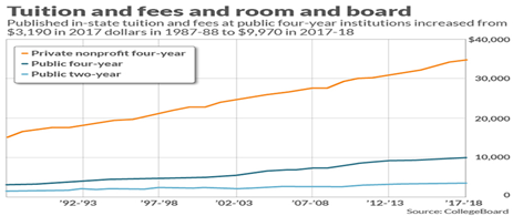The above MarketWatch graph shows the huge cost disparities between public and private colleges, and many studies confirm that a public college or university education breeds as much success on reaching student life goals as do private schools.