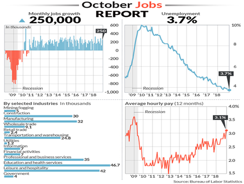 “The rapidly growing economy generated a sizzling 250,000 new jobs in October, keeping the unemployment rate at a 48-year low and pushing the increase in worker pay to the highest level in more than nine years,” said MarketWatch’s Jeffery Bartash.
