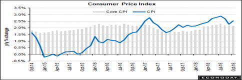The benchmark 10-year Treasury Bond Yield that determines mortgage and other long term rates ended at 3.13 percent today from 3.11 percent last week with the continued stock market selloff. It was as high as 3.22 percent at times. The Fed is on track to raise short term interest rates another one-quarter percent in December, which will boost the Prime Rate used for credit card and installment debts to 5.50 percent. What does that mean for continued job and economic growth?