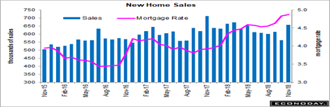 This could be boosting new-home sales, which eventually boosts housing construction. Sales of newly built, single-family homes jumped 16.9 percent to a seasonally adjusted annual rate of 657,000 units in November after an upwardly revised October report, reports the NAHB, and according to newly released data by the U.S. Department of Housing and Urban Development and the U.S. Census Bureau. This is the highest sales pace since March 2018. However, on a year-to-date basis, sales are down 7.7 percent from this time in 2017.