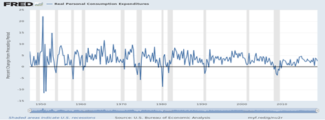 Hence Personal Consumption Expenditures (PCE) continue to fall, in line with more slowly rising personal incomes (for the 99 percent) and inflation. This FRED graph shows that PCE consistently grew at more than 5 percent until 2000, when it began to plunge to as low as -3.7 percent during the Great Recession, and finishing up +2.5 percent in Q4 2018.