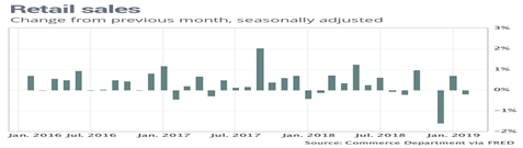 And, there was a 35-day government shutdown in December, which further depressed incomes and sales. Retail sales picked up slightly in January, but February isn’t looking so good with sales negative for the second time in 3 months, per the FRED graph.