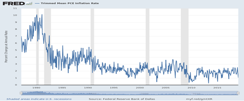 Why has the Fed stopped raising their interest rates? Because this is the lowest inflation rate for ‘core’ consumption expenditures in three decades, as this FRED graph from 1980 onward portrays.