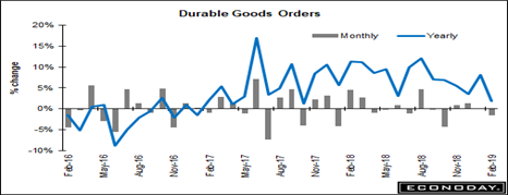 Another sign of a manufacturing activity slowdown was the decline in February Durable Goods Orders reported earlier this week. There was a cooling for aircraft orders, so that durable goods orders fell -1.6 percent with the ex-transportation reading very low at just a 0.1 percent gain.