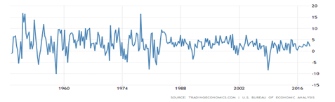 Considering full 2018, the economy advanced 2.9 percent, the most since 2015 and above 2.2 percent in 2017. In reality, growth has been trending down since the 1980s. However, GDP Growth Rate in the United States averaged 3.22 percent from 1947 until 2018, reaching an all-time high of 16.70 percent in the first quarter of 1950 and a record low of -10 percent in the first quarter of 1958,” which illustrates the uncertainty of predicting growth for any quarter, per the graph.