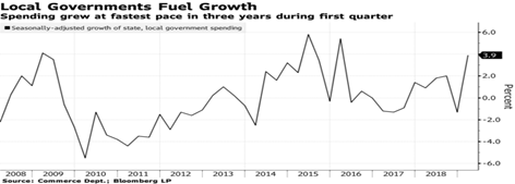 Bloomberg News reported as part of the GDP report, “The Commerce Department on Friday said state and local government spending increased at an annual rate of 3.9 percent in the first quarter, the most since the start of 2016, because of a “turnaround in investment, most notably in construction of highways and streets.”