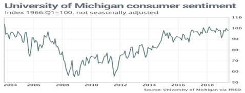 Actually, sentiment has been fluctuating in that range for several years, per the FRED graph, as economic growth and employment finally ramped up in 2015 after the Great Recession, boosting consumer confidence.