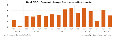American consumers don’t seem to care about signs of slowing growth in manufacturing and housing, as most can find good jobs and rising wages, and they are flush with cash. The BEA reports disposable personal income increased $193.4 billion, or 4.9 percent, in the second quarter, compared with an increase of $190.6 billion, or 4.8 percent, in the first quarter. Real disposable personal income (after inflation is factored in) increased 2.5 percent, compared with an increase of 4.4 percent in Q1.
