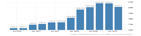 The result was has been record income inequality, as many manufacturing and other high-paying jobs were exported overseas via the growth of multinational corporations in the name of globalization. The FRED graph above illustrates the growth of corporate profits (blue line) over wages and salaries (red line), particularly since the last two recessions (gray columns).