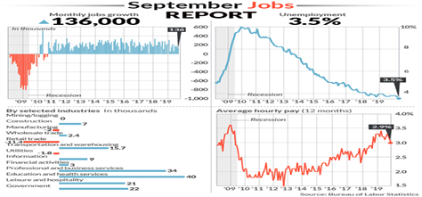 With manufacturing activity weak, most hiring in September was concentrated in the services sector. Education and health care providers filled 40,000 positions. Government added 22,000 workers in September, but only 1,000 of the jobs were due to federal hiring for the 2020 Census. Economists had expected a much bigger increase in census workers. Job growth has slowed from 223,000 per month in 2018 to 158,000 over the last three months.
