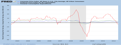 The result? Both the Producer Price Index for wholesale goods out today (red line in graph), and probably the upcoming Consumer Price Index (dark blue line) shows where we are heading.