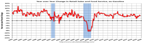 The Atlanta Fed nowcast said, “The GDPNow model estimate for real GDP growth (seasonally adjusted annual rate) in the fourth quarter of 2019 is 0.3 percent on November 15, down from 1.0 percent on November 8. After this morning’s retail trade releases from the U.S. Census Bureau, and this morning’s industrial production report from the Federal Reserve Board of Governors, the nowcasts of fourth-quarter real personal consumption expenditures growth and fourth-quarter real gross private domestic investment growth decreased from 2.1 percent and -2.3 percent, respectively, to 1.7 percent and -4.4 percent, respectively.”