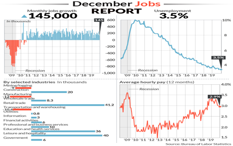 The Labor Department also reported, “In 2019, payroll employment growth totaled 2.1 million, compared with a gain of 2.7 million in 2018. Incorporating revisions for October and November, which decreased payrolls by 14,000, monthly job gains averaged 184,000 over the past 3 months.”