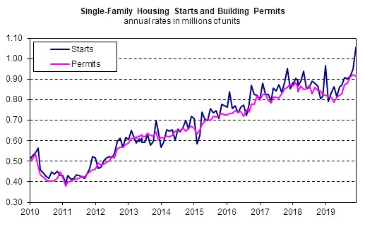 Total housing starts for 2019 were 1.29 million, a 3.2 percent gain over the 1.25 total from 2018. Single-family starts in 2019 totaled 888,200, up 1.4 percent from the previous year. Multifamily starts in 2019 totaled 401,600, up 7.3 percent from the previous year.