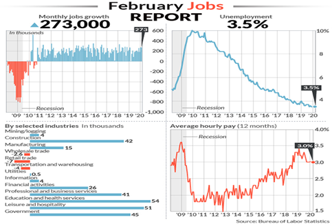 The Labor Department’s February employment survey took place in the middle of February, before the coronavirus began its worldwide spread. So we will have to wait for March employment figures to know its impact on employment, and almost every business sector in the U.S. economy.