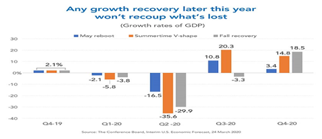 The other two scenarios are called ‘V’ and ‘U’-shaped recoveries by economists, meaning the recoveries would take longer. The V-shape means a quicker recovery with a more severe downturn, as can be seen in the Conference Board graph. The ‘U’ shape means the downturn and return to growth is more gradual and over a longer term.