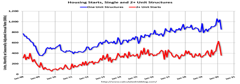 But housing starts are still up 1.4 percent annually from the March 2019 rate. This is a sign that builders aren’t that pessimistic about future prospects, even during a pandemic when prospective buyers can’t visit models, and documents can’t be handled face-to-face.