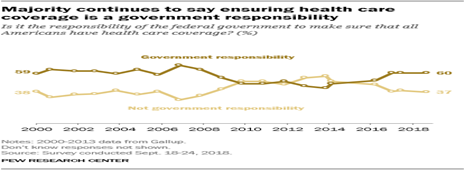 Six-in-ten Americans say it is the federal government’s responsibility to make sure all Americans have health care coverage, including 31 percent who support a “single payer” approach to health insurance, according to a 2018 national survey by Pew Research Center.