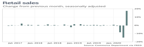 And retail sales jumped 17.7 percent last month, the government said Tuesday, after two months of record declines. Sales had tumbled by a record 14.7 percent in April and 8.2 percent in March. The rebound in sales also reflects the loosening of restrictions on business activity after two months of stay-at-home orders to combat the coronavirus pandemic.