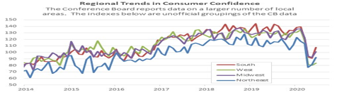 Consumer confidence is returning from its recent lows over the past two months with it main index up 12.1 points for a 3-month high in May as the lockdowns ease in some states, said the Conference Board today. The above graph shows the differences in the four U.S. regions, with the South having the highest and Northeast the lowest confidence levels.