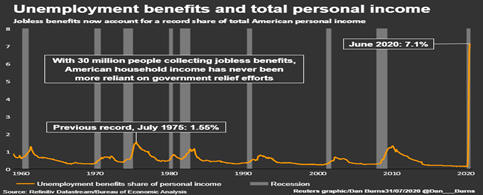 The above Reuters graph highlights the record 7.1 percent boost given by the additional benefits since the CARES Act was implemented.
