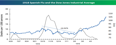 The financial markets were affected by death rate surges, in particular, but recovered quickly, as the combined Spanish flu-DOW Jones graph shows. The DOW fell slightly during each of the three spikes in death rates. It finally began its rise to new heights in the spring of 1919 only after the third spike, but the recession for most Americans didn’t formally end until 1922, according to the National Bureau of Economic Research (NBER).