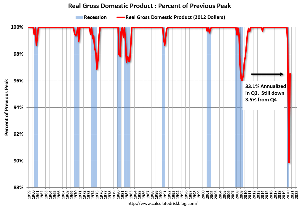 We are not really out of the COVID recession, per Calculated Risk graph, even though the US Bureau of Economic Analysis (BEA) “advance” estimate of third quarter GDP growth increased +33.1 percent. But it’s still 3.5 percent below last year’s fourth quarter growth rate.