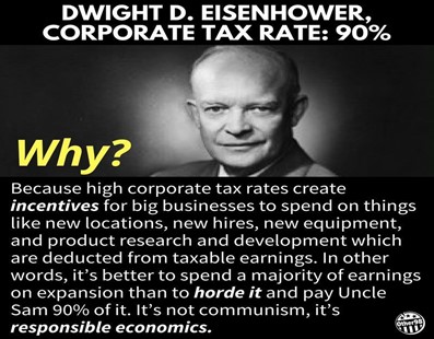And that was in large part because of the sky-high tax rates for the wealthiest and corporations that prevailed immediately after World War Two—as high as 90 percent during the Eisenhower years and beyond. As President Eisenhower once put it, higher taxes induce people and businesses to invest more in their future, rather than pay Uncle Sam.