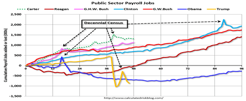 However the public sector declined significantly while Mr. Obama was in office (down 277,000 jobs), and during the 46 months of Mr. Trump’s term, the economy has lost 870,000 public sector jobs.