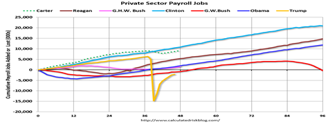 Private sector employment increased by 20,970,000 under President Clinton (light blue) in the excellent Calculated Risk, by 14,714,000 under President Reagan (dark red), 11,849,000 under President Obama (dark blue). 9,039,000 under President Carter (dashed green), and 1,511,000 under President G.H.W. Bush (light purple).