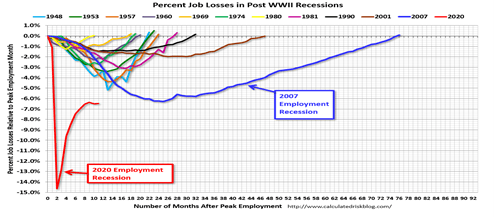The Calculated Risk red line in graph portrays the damage done by the pandemic in the 10th month of this recession vs. earlier recessions, with 10 million jobs still lost and almost 20 million receiving unemployment benefits of some kind.