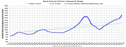 The Calculated Risk graph dating from 1976 shows the various price bubbles in the 1970s, 80s, 2007 housing bubble, and today. It shows prices rising again at almost the same clip as during the housing bubble.