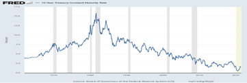 They love to use other peoples’ (borrowed) money to finance their stock, bond and commodity market transactions, if possible. And interest rates have been at rock bottom over the past year; close to zero for short-term rates, and the 10-year benchmark treasury yield below one percent for much of the time. It is still in a daily trading range of 1.5-1.6 percent, per the below FRED graph.