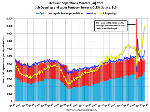 The number of job openings increased to a series high of 10.1 million on the last business day of June (yellow line on CR graph), the U.S. Bureau of Labor Statistics reported on Monday.