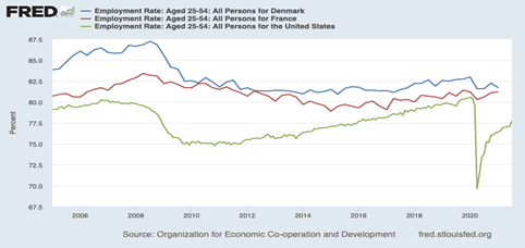 The above FRED graph cited by Nobel prize-winning economist Paul Krugman in fact debunks that claim. Europeans, including Denmark and France (red and blue lines in graph), have a higher percentage of working aged adults 25-44 than the US (green line). They also have higher minimum wages, universal health care, and take longer vacations than Americans.