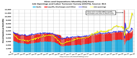 In fact, many of those quitting were shifting to better jobs, not leaving the workforce. Quits were up 34 percent year-over-year to a new record high. These are voluntary separations that generally mean they are finding better jobs. (see light blue columns for “quits”).