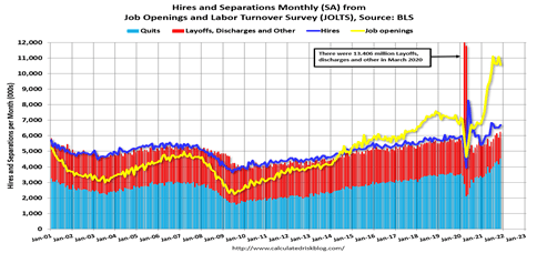 The Bureau of Labor Statistics reported that job openings decreased in November to 10.6 million from 11.1 million in October (yellow line in above graph).