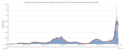 The Omicron variant may be waning, for starters. As of January 19, 2022, the current 7-day moving average of daily new cases (744,616) decreased 5.0% compared with the previous 7-day moving average (783,922).
