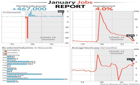 ‘Total nonfarm payroll employment rose by 467,000 in January, and the unemployment rate was little changed at 4.0 percent, the U.S. Bureau of Labor Statistics reported today. Employment growth continued in leisure and hospitality, in professional and business services, in retail trade, and in transportation and warehousing.”