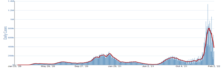 In fact, Omicron variant infections are declining faster than expected. As of February 2, 2022, the current 7-day moving average of daily new cases (378,015) decreased -37.6 percent compared with the previous 7-day moving average (605,735), reports the CDC’s Covid Tracker. Omicron infections are sharply down from the more than 800,000 at its peak in January.
