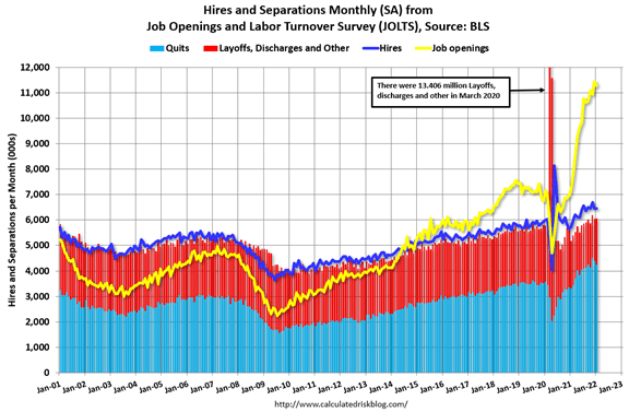 “The number of job openings was little changed at 11.3 million on the last business day of January, the U.S. Bureau of Labor Statistics reported today. Hires and total separations were little changed at 6.5 million (blue line in Calculated Risk’s graph) and 6.1 million (red bars), respectively.”