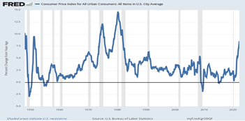 Scary as that may be, the FRED graph shows that it has been higher in 1974 and 1980 during the Arab oil embargos when it rose to 14 percent, per the FRED graph. Inflation is also happening with commodities such as wheat and oil because of the sanctions against Russia for invading Ukraine and threatening the West with nuclear weapons if NATO interfered with Putin’s wholesale destruction of another country.