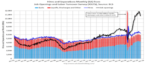 The number of job opening didn’t rise above the longer term normal of 6-7 million openings until January 2017, per the Calculated Risk graph. That is when economic growth began to take off, and it rose sharply to its current nosebleed range of 11 million openings after the two-month 2020 recession.
