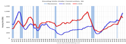 An estimated 1,553,300 housing units were started in 2022 (red line single unit, blue line 2+nnits in above graph). This is 3.0 percent below the 2021 figure of 1,601,000, so housing construction is also in a “swoon”.